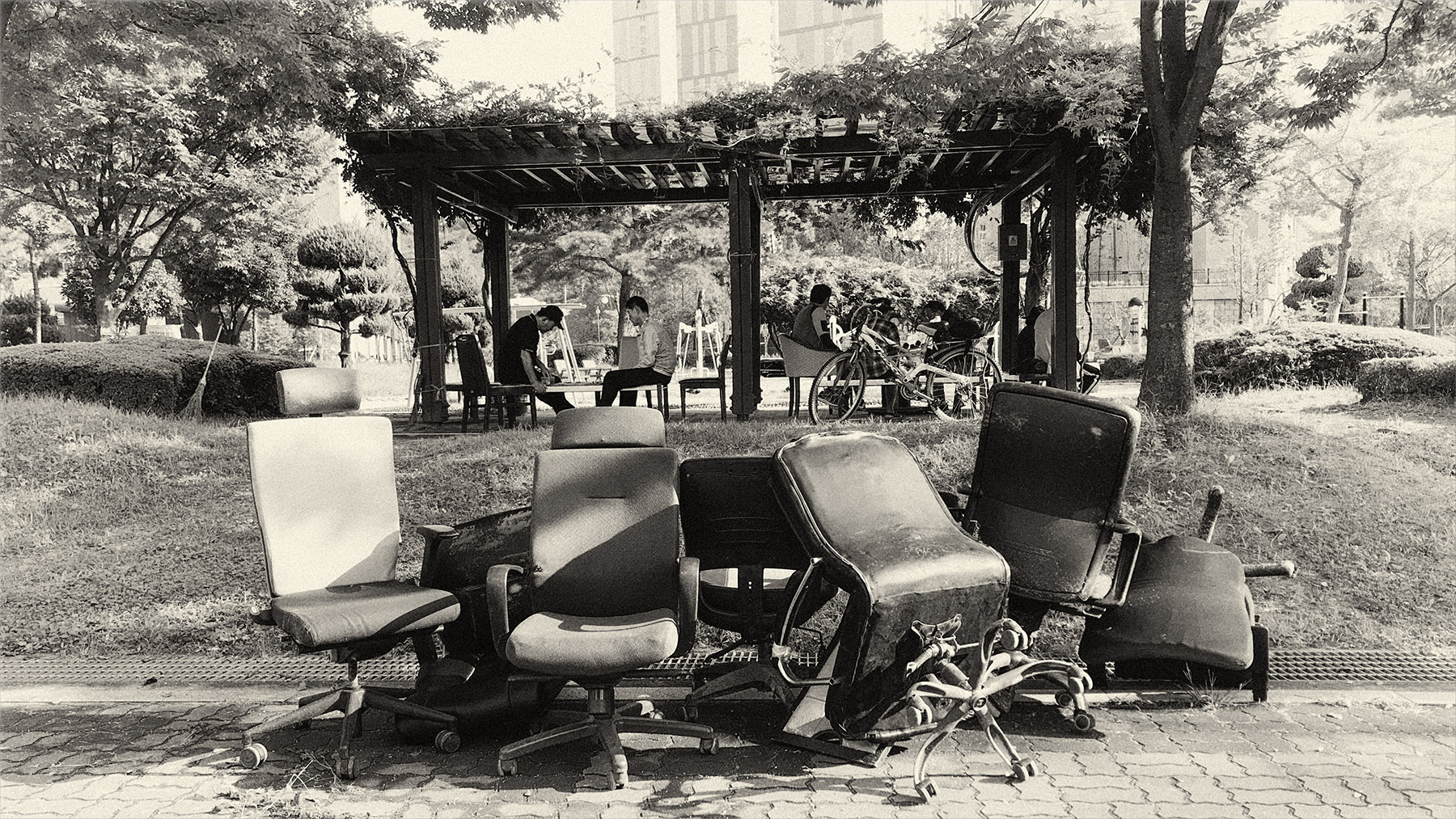 공원에 버려진 천수를 다한 쓰레기 의자들,